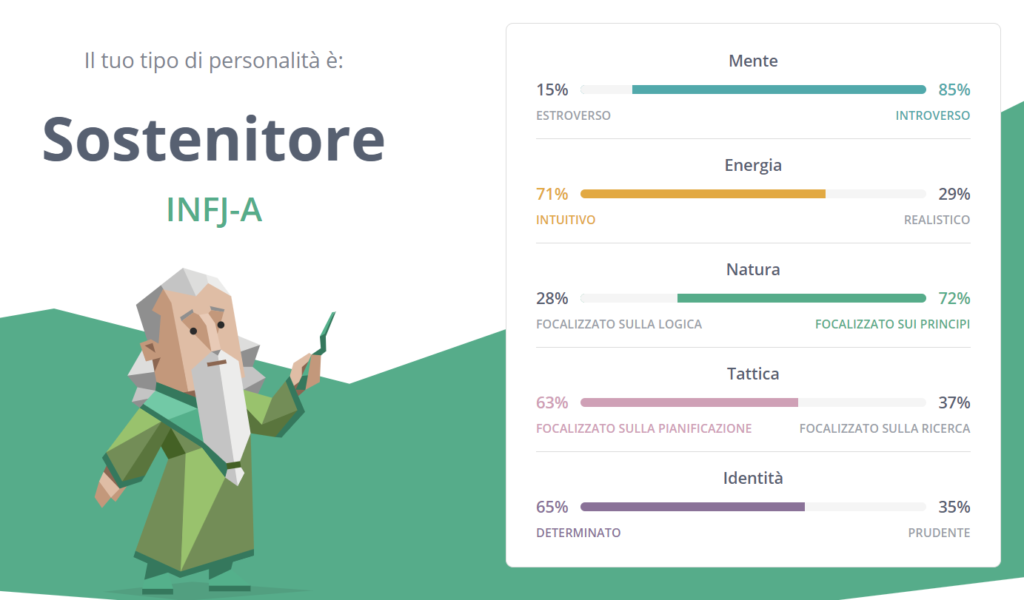 Per una candidatura mi è stato chiesto di sottopormi a un test attitudinale (16personalities.com). Il risultato mi ha stupito particolarmente per l’effettiva aderenza al mio carattere e alla mia predisposizione. Trovi l’esito del test nell’immagine qui sopra e puoi approfondire la mia personalità su questo sito.